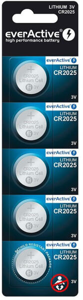 CR2025 EverActive lítium gombelem kiváló minőségű, megbízható áramforrás, amely ideális kalkulátorokhoz, órákhoz, kulcstartókhoz, távirányítókhoz és számos egyéb kis elektronikai eszközhöz. Kompakt méretének köszönhetően könnyen elfér zsebben, táskában vagy fiókban tartalék elemként is.